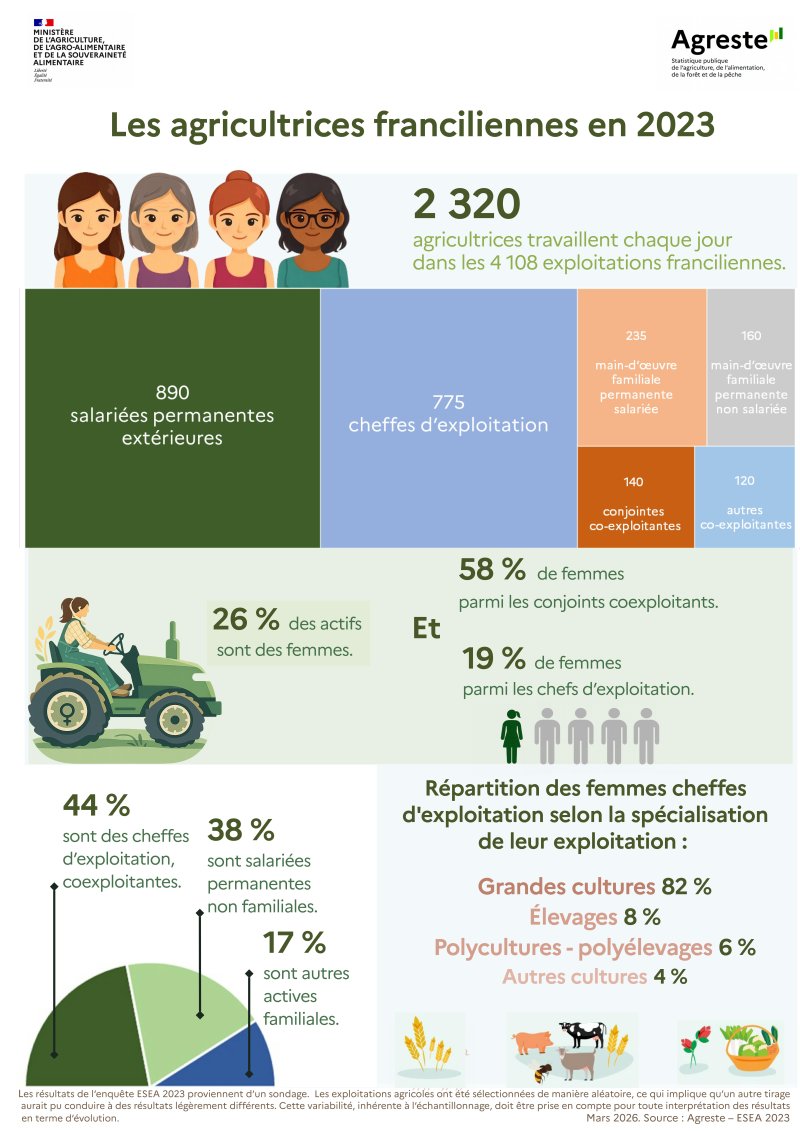 Pour en savoir plus : Agreste. Recensement agricole 2020 Portrait des femmes dans l’agriculture francilienne. Collection études Île-de-France, mars 2024, n°1.