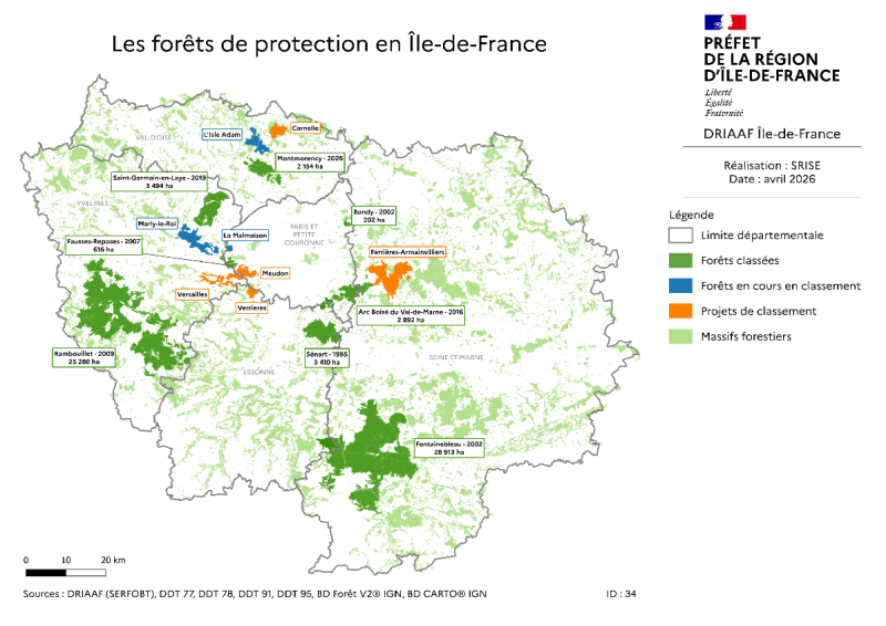 Par décret du Premier ministre paru au Journal officiel le 1er avril 2026, la forêt de Montmorency (Val d’Oise) est classée en forêt de protection. Le périmètre du classement couvre 2154 hectares et concerne une partie du territoire des communes de Andilly, Bessancourt, Béthemont-la-Forêt, Bouffémont, Chauvry, Domont, Frépillon, Montlignon, Montmorency, Piscop, Saint-Brice-sous-Forêt, Saint-Leu-la-Forêt, Saint-Prix, Tavergny et Villiers-Adam.