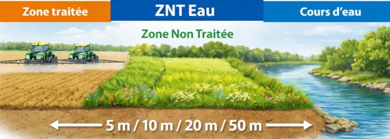 L’arrêté du 4 mai 2017 relatif à la mise sur le marché et à l’utilisation des produits phytopharmaceutiques et de leurs adjuvants définit une ZNT par défaut de 5 m aux abord des points d’eau. Cette ZNT concerne tous les produits phytopharmaceutiques (à l’exception des utilisations sur plantes aquatiques ou semi-aquatiques ou sur rizière) et peut être portée à 20 ou 50 m selon l’autorisation de mise sur le marché du produit.